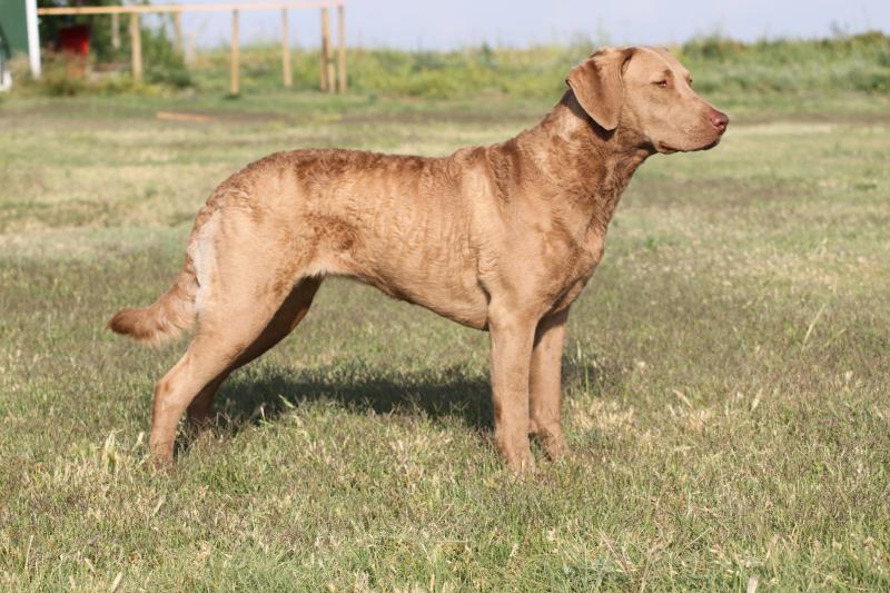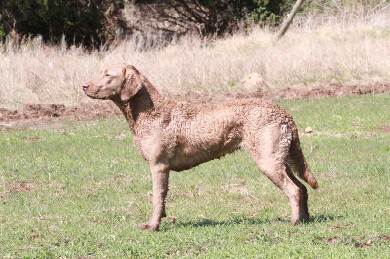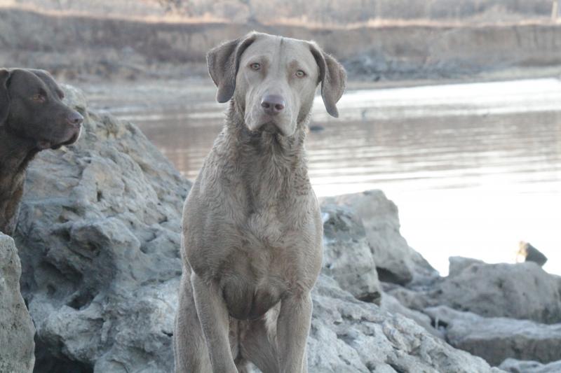 Sapphire was purchased from Dyane Baldwin at Pond Hollow Chesapeakes and is out of Ch Pond Hollow Continental Divide x Ch Rock Point Thief in the Night. She is very birdy, likes to jump and swim, and is eager to please as well as having a great temperament and very nice movement and conformation. She has a fun personality and likes to "roo roo". Sapphire completed her championship title in October 2013!!!